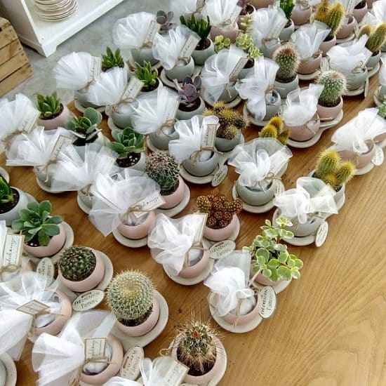 ¿Por qué no añadir algo de textura a las mesas de los invitados? Mira estos recuerdos de bodas hechos con cactus.